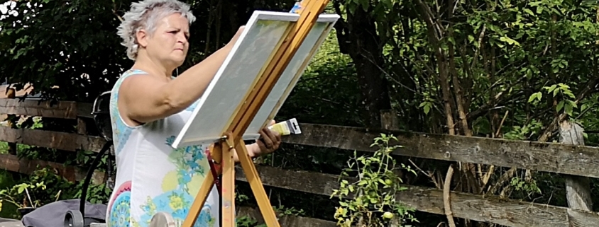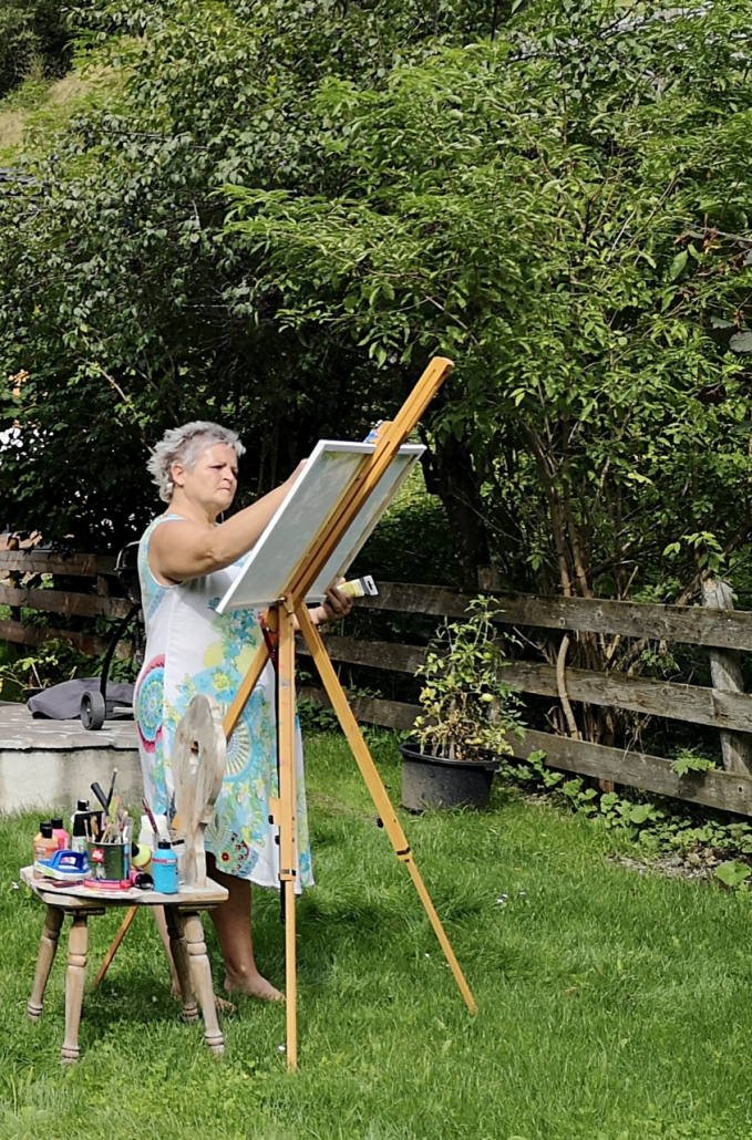 Im Sommer nutze ich natürlich die Gelegenheit und geh in den Garten um zu malen. Es ist ein anderes Feeling , Barfuß im Garten zu stehen. Den Boden unter meinen Füßen zu spüren , mich zu verbinden mit Mutter Erde .Im Hintergrund nehme ich das plätschern vom Bach wahr und die Sonne scheint mir ins Gesicht . Nachdem ich meine Malutensilien bereit gestellt habe , begebe ich mich für einen Moment in meine Herzverbindung und lasse mich führen . Mit dem Input den ich bekomme starte ich und bin am Ende überrascht was für einzigartige Bilder entstehen dürfen .